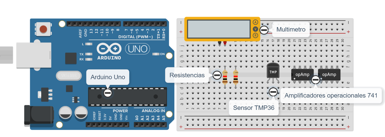 Descripción: La idea es hacer un procedimiento análogo al que se expuso en la sección de sensores y señales pero ahora para el caso del encapsulado TMP36. La idea es implementar también el circuito con la ayuda de aplificadores operacionales para ello, debido a la carencia de los componentes necesarios de forma presencial, se sugiere usar un plataforma de simulación que tiene este sensor (TinkerCAD). Allí podrá crear el circuito e incluso hacer mediciones con el multimetros que integra. Al final del acondicionamiento se espera que el rango de voltajes de la señal cubra todo el intervalo de 0 V a 5 V. A continuación se muestra las componentes necesarias que deberá buscar en el simulador.