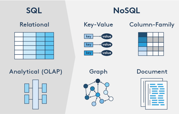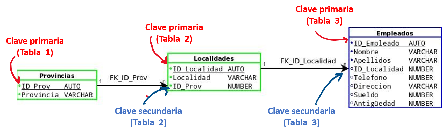 En este contexto se pueden distinguir varios tipos de bases de datos (ver Fig 23.), que pueden ser SQL o NoSQL[1]. Particularmente, usted seguramente está familiarizado con: Las relacionesles (RDB - relational data base) y las documentales. Las primeras son las más comunes y consisten en bases de datos donde la información se organiza en tablas diferentes, las cuales pueden tener o no vínculos entre ellas mediante claves primarias y secundarias (o foráneas). En la Fig 24. se ilustra esto, se puede observar cómo tres tablas distintas están relacionadas mediante sus claves. Dentro de esta categoría, uno de los gestores más significativos es MySQL.