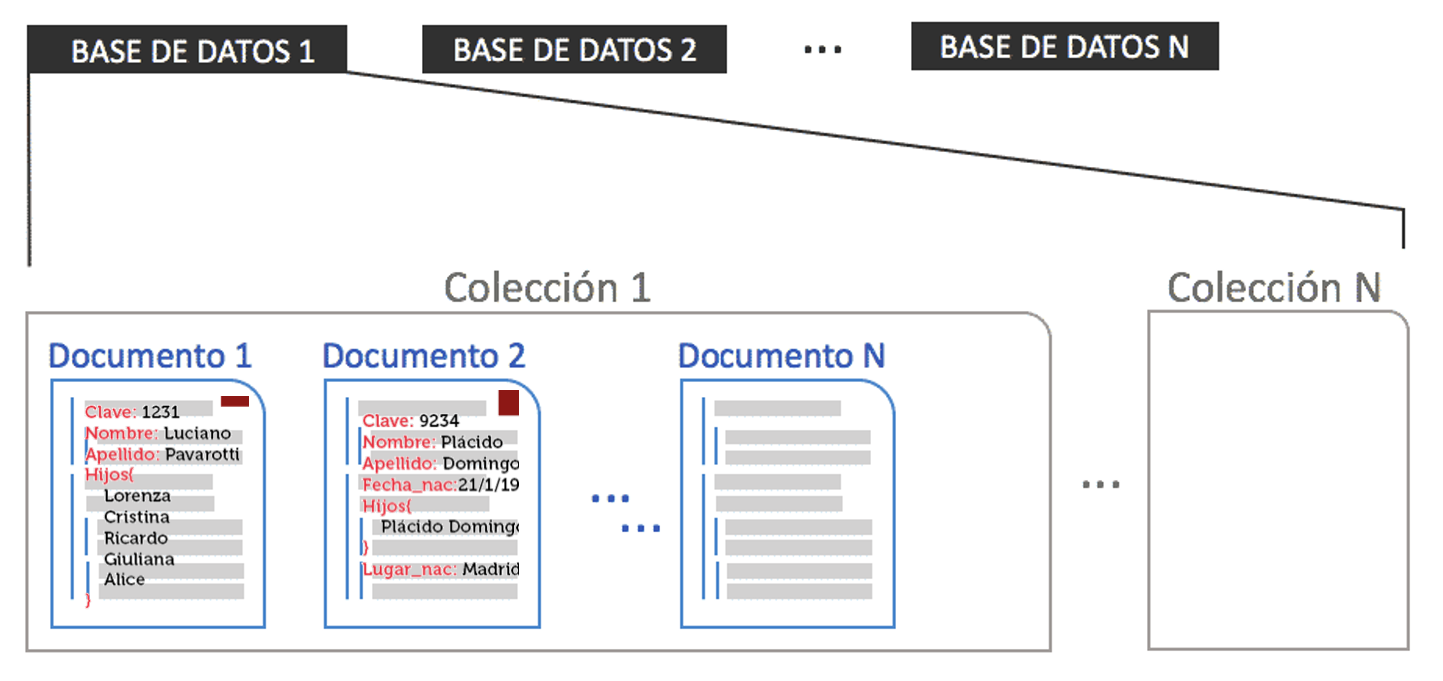 Por otro lado, las bases de datos documentales son una de las principales variantes de las bases de datos no relacionales (NoSQL). Se caracterizan por almacenar la información en registros, cada uno de los cuales funciona como una unidad autónoma de información. Como su nombre lo indica, esos registros se almacenan como documentos con información semiestructurada, generalmente utilizando la notación de objetos de JavaScript (JSON). Dentro de esta categoría, un gestor significativo es MongoDB. En adelante nos enfocaremos en este último ya que es de código abierto y, general, es fácil de usar.